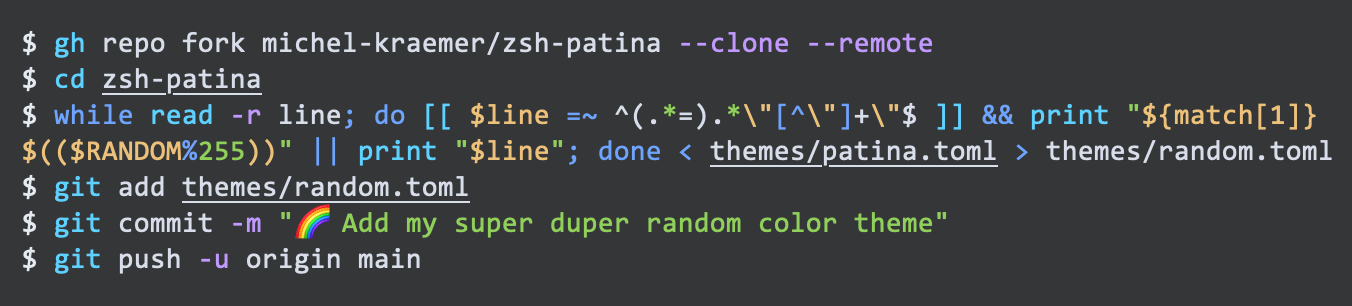 That being said, a fast prompt without any extensions looks dull 🙃 I tested some Zsh plugins like the popular zsh-syntax-highlighting and fast-syntax-highlighting. Great products, but I wasn’t satisfied. zsh-syntax-highlighting, for example, caused noticeable input lag on my system and fast-syntax-highlighting wasn’t accurate enough (some parameters were colorized, some not; environment variables were only highlighted to a certain length, etc.). I wanted something fast AND accurate, so I developed zsh-patina.